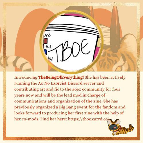 Introducing TBOE! Head mod on this project and an aoex fan for years now, she’s thrilled to be able to create something for the fandom and hopes everyone enjoys the zine!