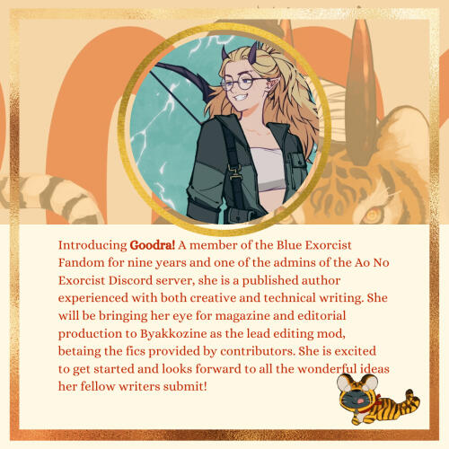 Introducing Artemis! Artemis will be working as an artist for this project. They grew up watching anime as a young adolescent and among one of the first was Blue Exorcist which they will always have a love for. This is their very first zine project and they hope to give it their all.